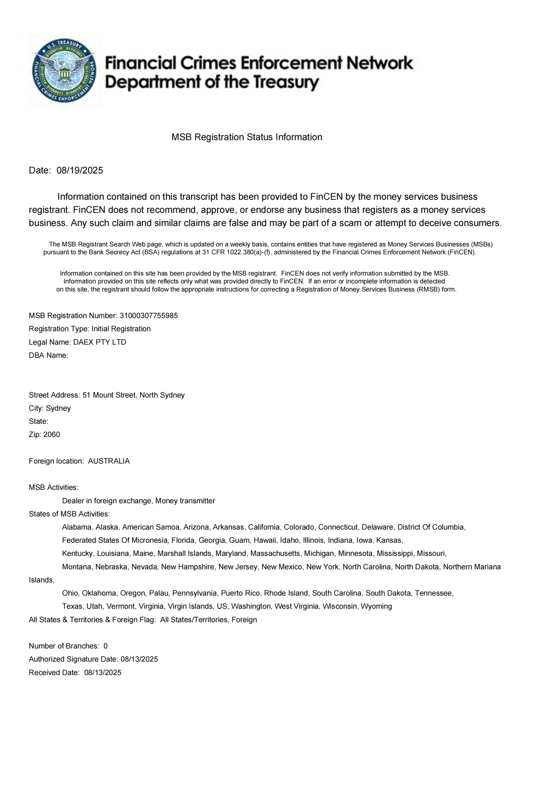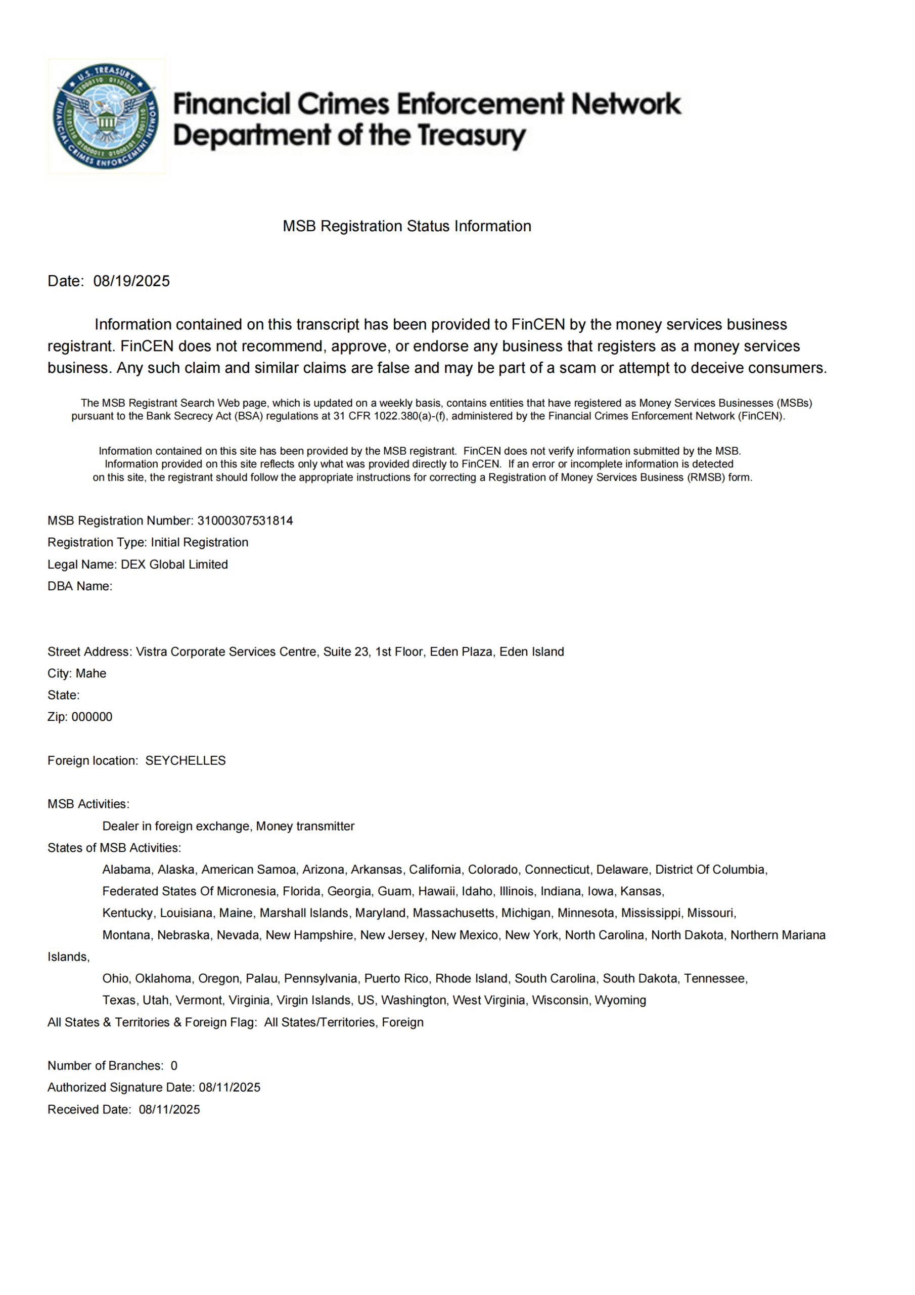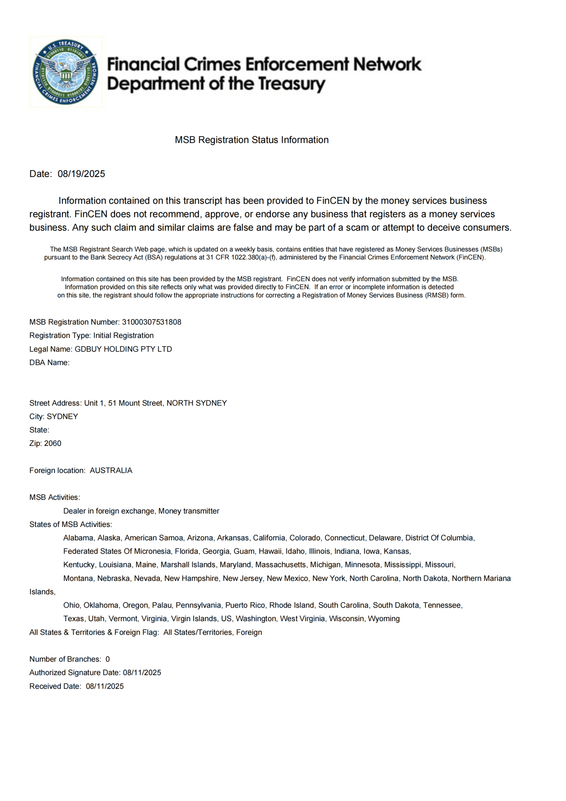 美国 FinCEN MSB 登记证书